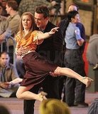 Jason Segel and Amy Adams embraced last night while shooting their Muppets movie in LA. They did their best to coordinate their dance moves during a musical scene, which they starred in alongside Kermit the Frog and Miss Piggy herself. The duo were hard at work on the film over the weekend as well, but both took Sunday night off to attend the Golden Globes. His Despicable Me was nominated, but didn't win, in the best animated feature category, while Amy made her latest award season appearance to support The Fighter. Jason hit the afterparty circuit in the Beverly Hilton and checked out the HBO bash, where he posed for photos with newly single January Jones and chatted with rumored couple Leighton Meester and Garrett Hedlund. Amy, meanwhile, hit the InStyle event with her fiancé, Darren Le Gallo. Jason and Amy have a few weeks more to go with their mutual project, while he does double duty also working on How I Met Your Mother. The secret to doing two jobs at once, Jason told us in December, is "economy of movement" - aka, lots of sitting!